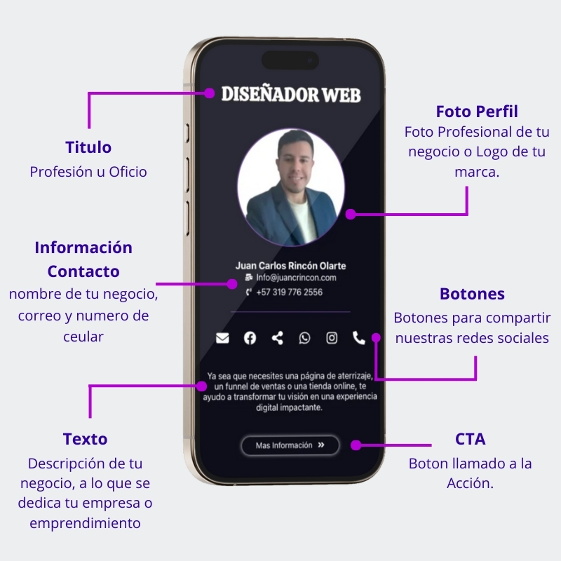 La tarjeta de Presentación Digital contiene los datos de contacto de una persona, a la Tarjeta Digital se accede por medio de Código QR o enlace Personalizado.